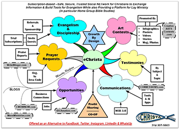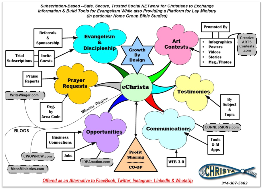 Quite some time ago, the Lord gave me a vision of a website & mobile APP that would be an alternative, safer place for Christian’s to exchange thoughts, conversations, ‘Testimonies’, graphical study aids and Infographics and to just Social Network with other Believers….rather than expose their faith through adversarial sites controlled by Facebook, Twitter, Google & YouTube. These sites don’t HAVE to have a monopoly on information and communications unless WE give it to them. This was way before people’s politics and worldly agendas became so clear. This is a CO-OPerative Marketing effort to put the USERS in charge and in control of this new site, its content and its development.